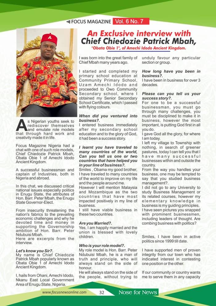 An exclusive interview with Chief Chiedozie Patrick Mbah, “Obata Obie 1”, of Amechi Idodo Ancient Kingdom