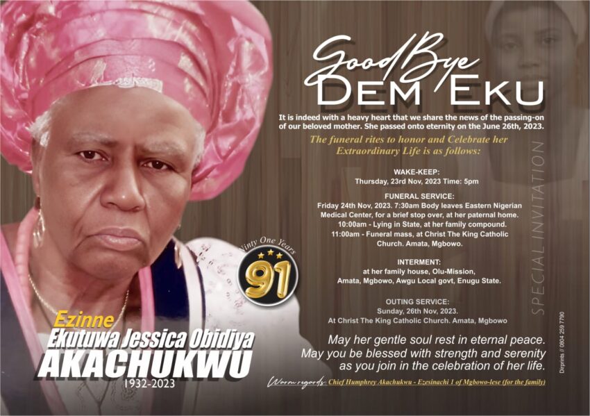 She will be committed to the mother Earth on Friday, 24th November 2023 at her husband compound, Onu Mission Amata Mgbowo.