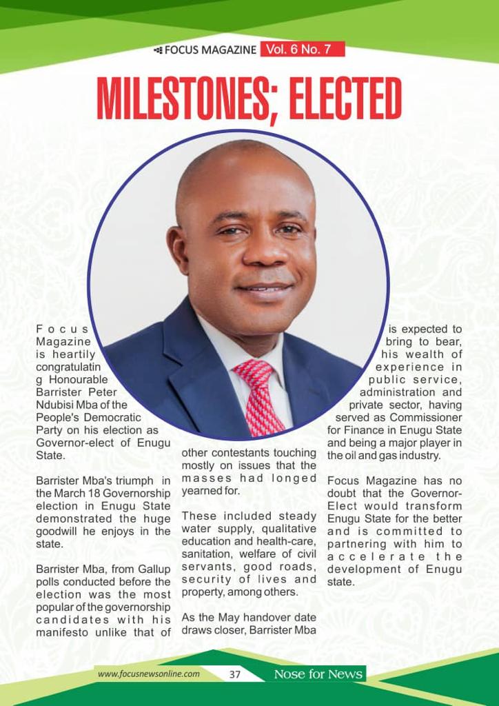 Focus magazine Nigeria heartily congratulates Hon. Barr. Peter Ndubuisi Mbah on his milestone election as Executive Governor of Enugu State
