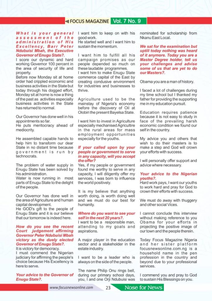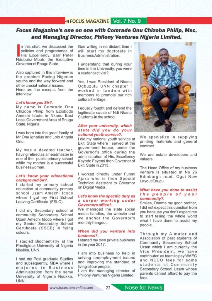 Focus Magazine’s One on One With a Business Leader Per Excellence, Comrade Onu Chizoba Philip, MBA and CEO Philony Ventures Nigeria Limited Posted on March 1, 2024March 1, 2024 by Sonia Onoja
