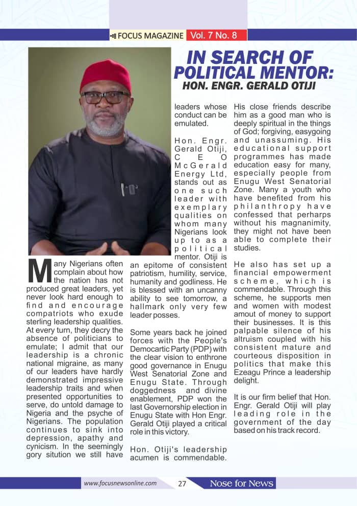 In search of political mentor, Hon. Engr. Gerald Otiji, Enugu State Commissioner For Works Posted on December 12, 2023 by Sonia Onoja