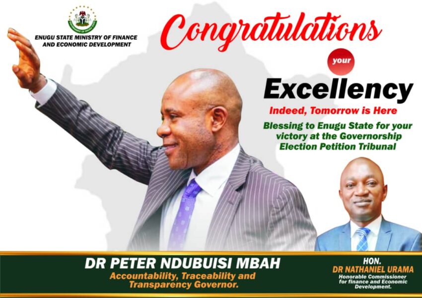 [9/22, 11:56 AM] Obama: The Hon. Commissioner, management, and staff of Enugu state Ministry of Finance and Economic Development profoundly extend their congratulatory message to you for your governorship election petition Tribunal victory.