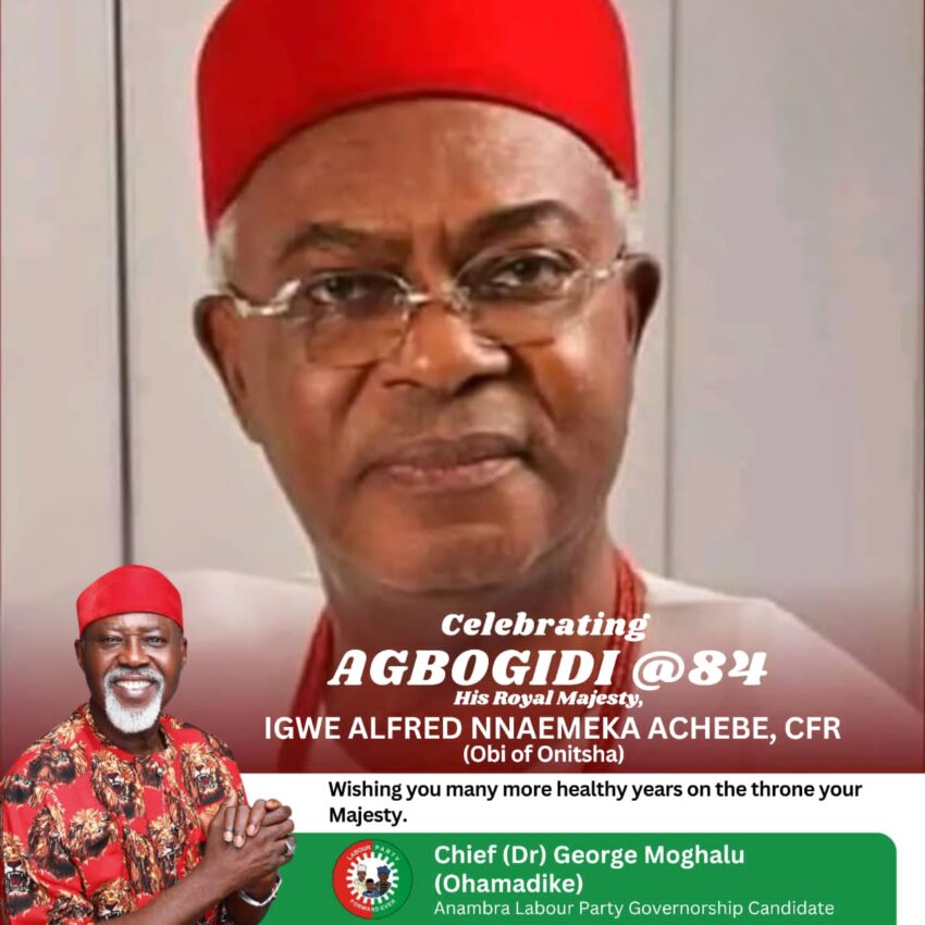 The Labour Party’s gubernatorial candidate in Anambra State and immediate past Managing Director of the National Inland Waterways Authority (NIWA), Chief Dr. George Moghalu, has extended warm congratulations to His Royal Majesty, Igwe Nnaemeka Alfred Achebe, CFR, MNI (Agbogidi), on the auspicious occasion of his 84th birthday.