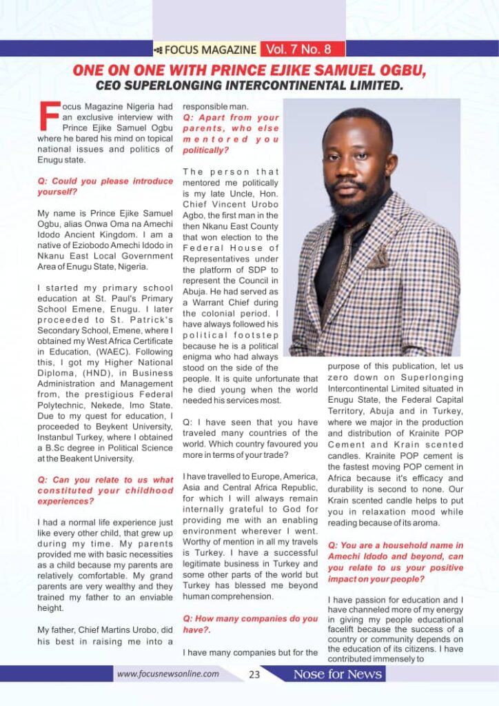 One on One with Prince Ejike Samuel Ogbu, CEO Superlonging Intercontinental Limited Posted on September 14, 2023 by Sonia Onoja