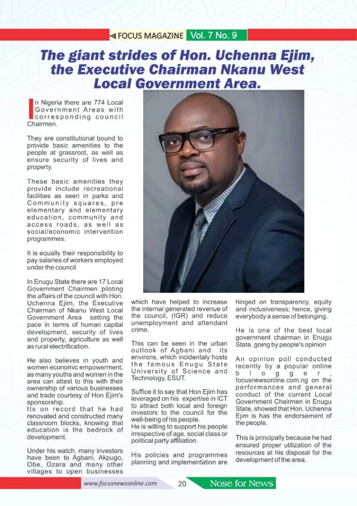 The giant strides of Hon. Uchenna Ejim, the Executive Chairman of Nkanu West Local Government Area. Posted on February 17, 2024 by Sonia Onoja