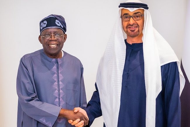 President Bola Tinubu, and his Emirati counterpart, Mohamed bin Zayed Al Nahyan in the United Arab Emirates on Monday.